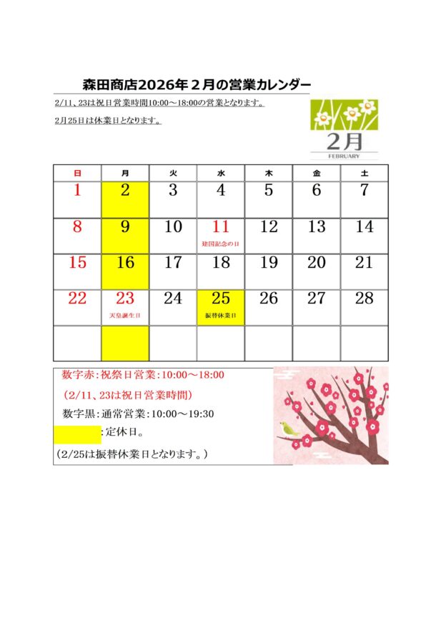 2月25日水曜日は振替休業日となりますので宜しくお願い致します。